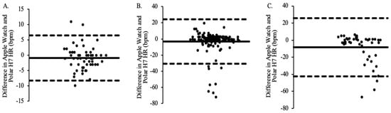 When comparing Apple Watch Series 9-measured HR to the Polar H7-measured HR for Group 1, a mean bias of −0.88 was obtained, with 95% limits of agreement ranging from −8.28 bpm to 6.53 bpm (Figure 5A). When comparing Apple Watch Series 9-measured HR to the Polar H7-measured HR for Group 2, a mean bias of −3.17 was obtained, with 95% limits of agreement ranging from −30.73 bpm to 24.39 bpm (Figure 5B). When comparing Apple Watch Series 9-measured HR to the Polar H7-measured HR for Group 3, a mean bias of −8.35 was obtained, with 95% limits of agreement ranging from −42.26 bpm to 25.55 bpm (Figure 5C).