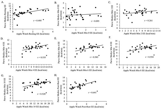 The relationship between the Apple Watch Series 9 and Parvo Medics on measures of energy expenditure (EE) for rest (panel A; r = 0.495; p < 0.001), 0 min (panel B; r = 0.095; p = 0.430), 2 min (panel C; r = 0.261; p = 0.220), 4 min (panel D; r = 0.535; p = 0.017), 6 min (panel E; r = 0.585; p = 0.002), 8 min (panel F; r = 0.554; p = 0.048), 10 min (panel G; r = 0.520; p = 0.003), and post-rest (panel H; r = 0.641; p < 0.001) in the participants in the study (N = 30). Data presented as values. * Statistical significance p < 0.05.
