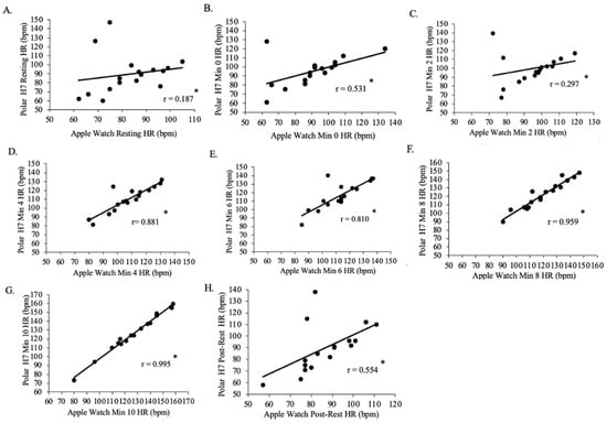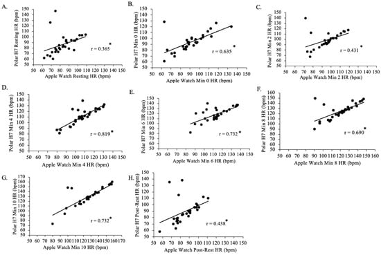 The relationship between the Apple Watch Series 9 and Polar H7 on measures of heart rate (HR) at rest (panel A; r = 0.365; p < 0.001), 0 min (panel B; r = 0.635; p < 0.001), 2 min (panel C; r = 0.431; p < 0.001), 4 min (panel D; r = 0.819; p < 0.001), 6 min (panel E; r = 0.732; p < 0.001), 8 min (panel F; r = 0.690; p < 0.001), 10 min (panel G; r = 0.732; p < 0.001), and post-rest (panel H; r = 0.438; p < 0.001) in the participants in the study (N = 30). Data presented as values. * Statistical significance p < 0.05.