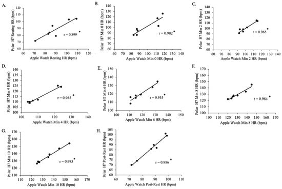 The relationship between the Apple Watch Series 9 and Polar H7 on measures of heart rate (HR) at rest (panel A; r = 0.899; p = 0.006), 0 min (panel B; r = 0.902; p = 0.005), 2 min (panel C; r = 0.965; p < 0.001), 4 min (panel D; r = 0.985; p < 0.001), 6 min (panel E; r = 0.955; p < 0.001), 8 min (panel F; r = 0.964; p < 0.001), 10 min (panel G; r = 0.993; p < 0.001), and post-rest (panel H; r = 0.986; p < 0.001) in the Group 1 participants in the study (n = 7). Data presented as values. * Statistical significance p < 0.05.