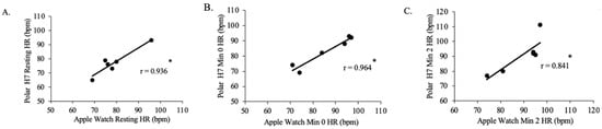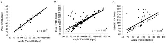 The relationship between the Apple Watch Series 9 and Polar H7 on measures of heart rate (HR) for all timepoints for Group 1 (A; r = 0.982; p < 0.001), Group 2 (B; r = 0.802; p < 0.001), and Group 3 (C; r = 0.675; p < 0.001). Data presented as values. * Statistical significance p < 0.05.
