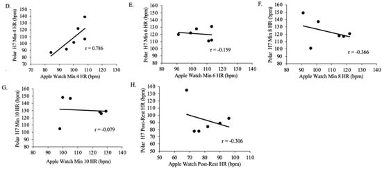 The relationship between the Apple Watch Series 9 and Polar H7 on measures of heart rate (HR) for rest (panel A; r = 0.936; p = 0.006), 0 min (panel B; r = 0.964; p = 0.002), 2 min (panel C; r = 0.841; p = 0.050), 4 min (panel D; r = 0.786; p = 0.064), 6 min (panel E; r = −0.159; p = 0.763), 8 min (panel F; r = −0.336; p = 0.658), 10 min (panel G; r = −0.079; p = 1.000), and post-rest (panel H; r = −0.306; p = 0.827) in the Group 3 participants in the study (n = 6). Data presented as values. * Statistical significance p < 0.05.
