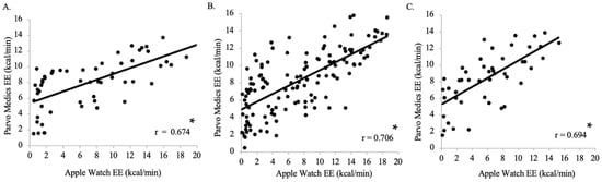 The relationship between the Apple Watch Series 9 and Parvo Medics on measures of energy expenditure (EE) for all time points for Group 1 (A; r = 0.674; p = < 0.001), Group 2 (B; r = 0.706; p = < 0.001), and Group 3 (C; r = 0.694; p < 0.001). Data presented as values. * Statistical significance p < 0.05.