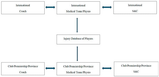 Proposed flow of communication for injury management. Communication needs to flow horizontally (between medical staff and coaching staff) and vertically between players’ clubs and their international camps.