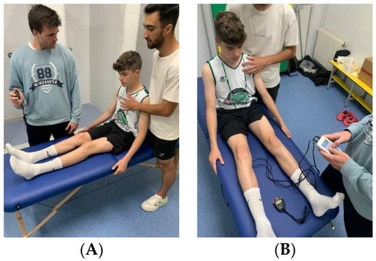 The Popliteal Angle Test is validated for measuring hamstring extensibility [] and is widely recognized as one of the most effective techniques for goniometric measurements []. Participants were placed in the supine position. A researcher held the hip flexion at 90° and passively extended the knee until the participant felt a strong stretch without pain. To ensure consistency, hip flexion was stabilized manually by the same researcher for all participants throughout the study. The examiner recorded the knee extension degrees at that moment using an inclinometer (Fabrication Enterprises Inc., White Plains, NY, USA) (Figure 2A) []. Each reading was taken within 2 s per trial to minimize the duration of muscle engagement and reduce potential cumulative effects. The test was repeated three times, and the average was obtained. A full knee extension corresponded to a value of 0 degrees, and a higher number of degrees indicated greater hamstring shortening.
