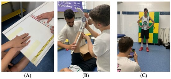 The Counter Movement Jump has been validated and standardized in adolescents for measuring jumping ability. The instructions for performing the jump were as follows: Start from an erect standing position with a straight torso, fully extended knees, hands on hips, and feet shoulder-width apart, maintaining this position for at least 2 s before the descent phase. During the push-off phase, perform a downward movement until the knee angle reaches approximately 90°. For the take-off phase, jump with maximal effort, and during the apex of the jump, keep the legs fully extended. The landing phase should occur with both feet together and knees fully extended (Figure 2C) []. The My Jump App, which has high reliability and validity for measuring vertical jump height in centimeters [], was used on an iPhone 11 running iOS 17.4.1. The captures were made using video recorded at 1080p resolution and 60 frames per second (fps). A greater height indicates a greater jumping ability.