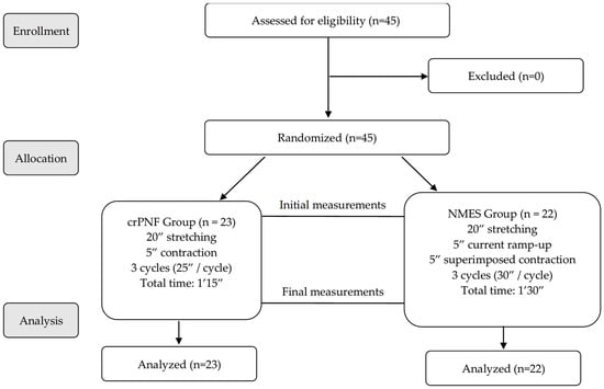 The primary objective of this study was to compare a crPNF protocol and a crPNF + NMES protocol to determine if they increase hamstring flexibility in the short term among young basketball players. The secondary objective was to assess whether either protocol negatively affected vertical jump capacity. To our knowledge, no studies to date have analysed the immediate effects of PNF stretching protocols, with or without NMES, in young athletes.