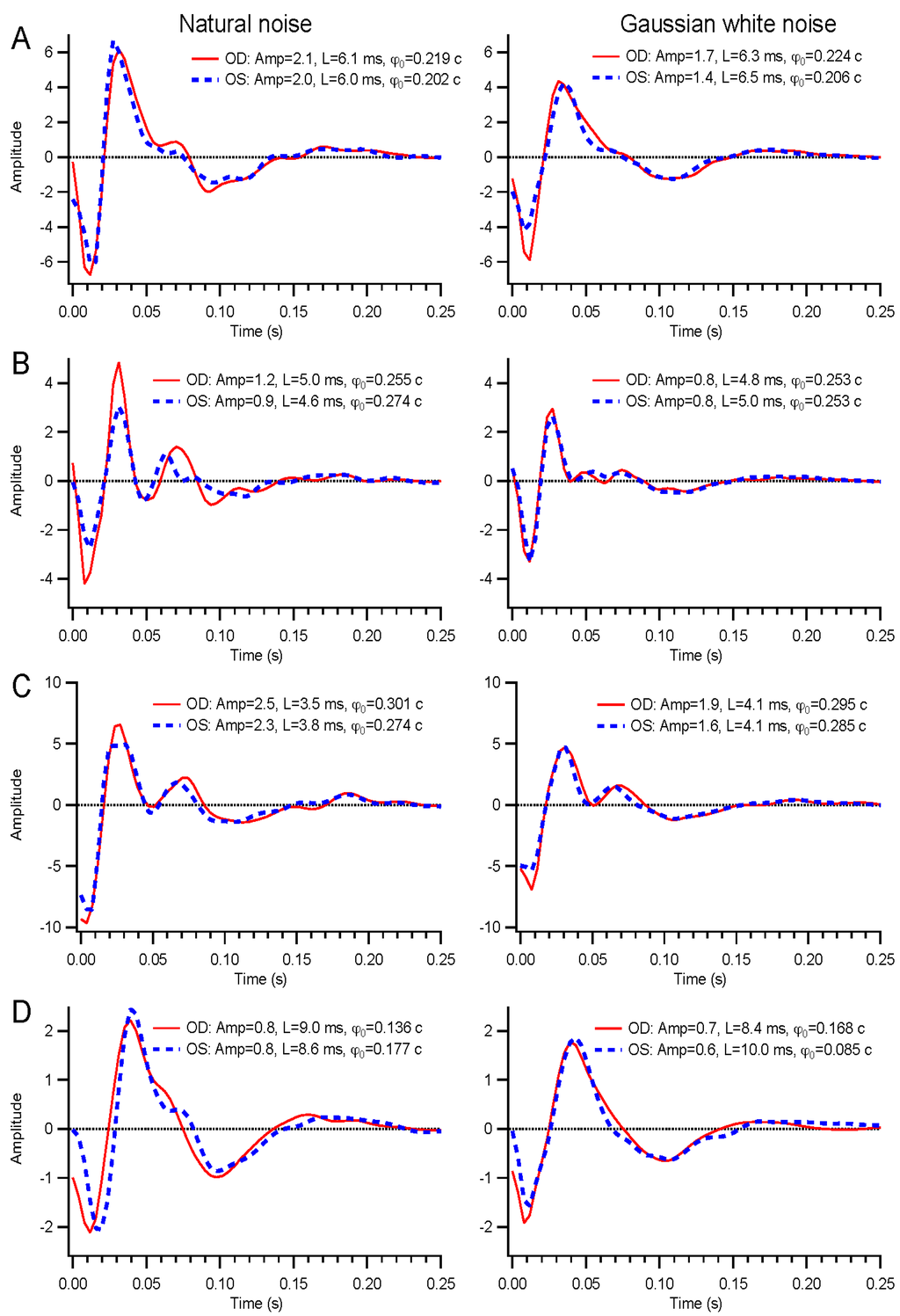 Basics of kernels. Examples of kernels from the right (solid red) and left (dashed blue) eyes of four subjects are illustrated, for natural noise on the left and Gaussian white noise on the right. Measured parameters are given as amplitudes (arbitrary units), latencies, and absolute phase. (A), 76-year old female; (B), 55-year old female; (C), 49-year old male; and (D) 27-year old female.