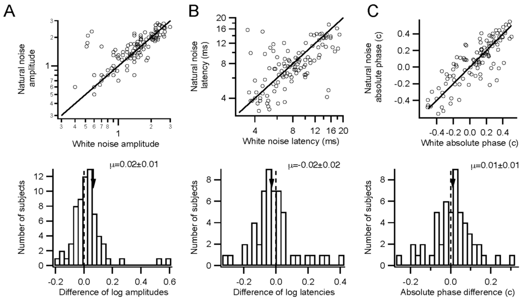 Discounting temporal correlations. (A) Amplitudes (arbitrary units) measured across a population of 67 subjects for natural (vertical axis) and white noise stimulation are plotted (upper graph). The ratio between the natural and white noise amplitudes is displayed as a histogram (lower graph) after averaging across the two eyes for each subject. Log mean ratio of amplitudes (arrow) is 0.02 ± 0.01 (p = 0.1, paired t-test), corresponding to 6% higher amplitudes for natural noise; (B) Latencies are plotted as in A, with log scaling. The log mean ratio of latencies is −0.02 ± 0.02 (p = 0.26). This corresponds to a mean ratio of latencies of 0.96; (C) Absolute phase values are plotted as in A. The mean difference in absolute phase is 0.01 ± 0.01 c (p = 0.36). Absolute phase is a cyclic variable, so −0.5 c is the same as +0.5 c.