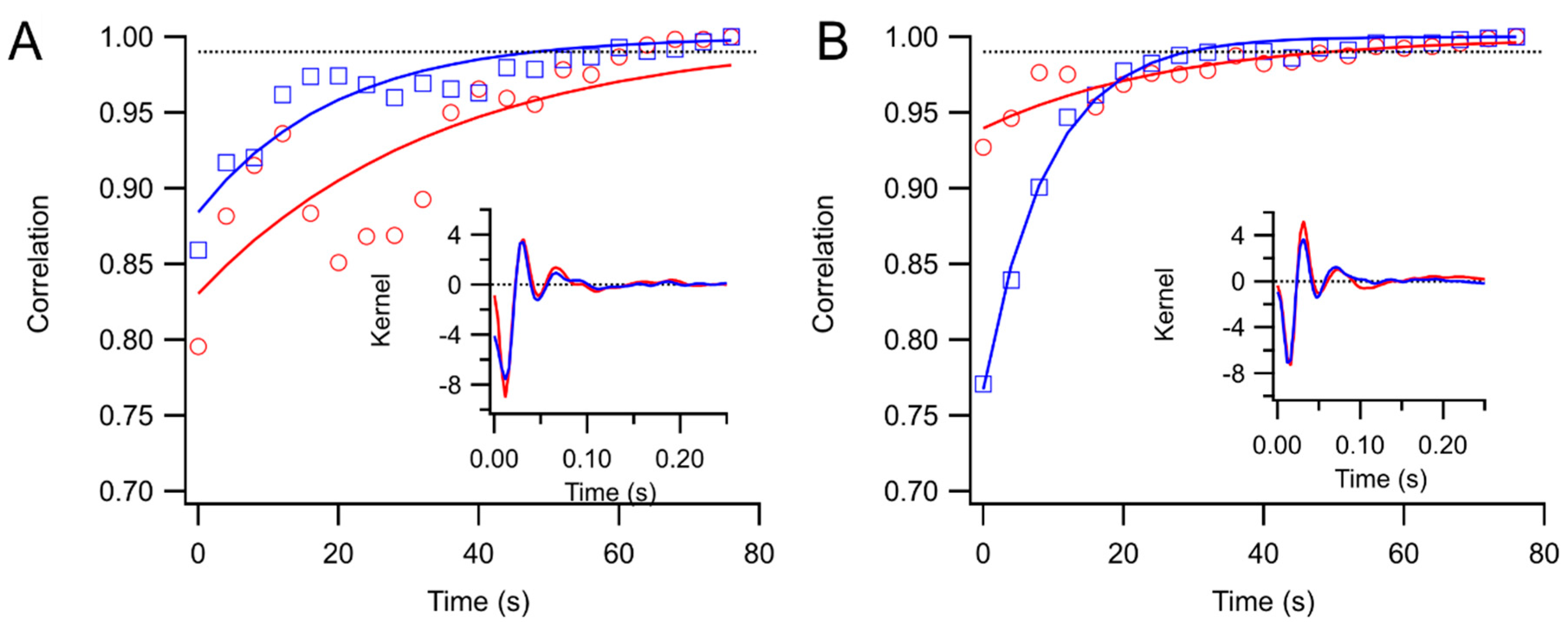 Examples of kernel convergence. Correlations of running kernel estimates with the final kernel are shown against testing time. The curves are exponential fits. The dotted line is at 0.99. The final kernels are shown in the insets. Traces with red circles are right eye and with blue squares left eye. (A) Natural noise; (B) Gaussian white noise.