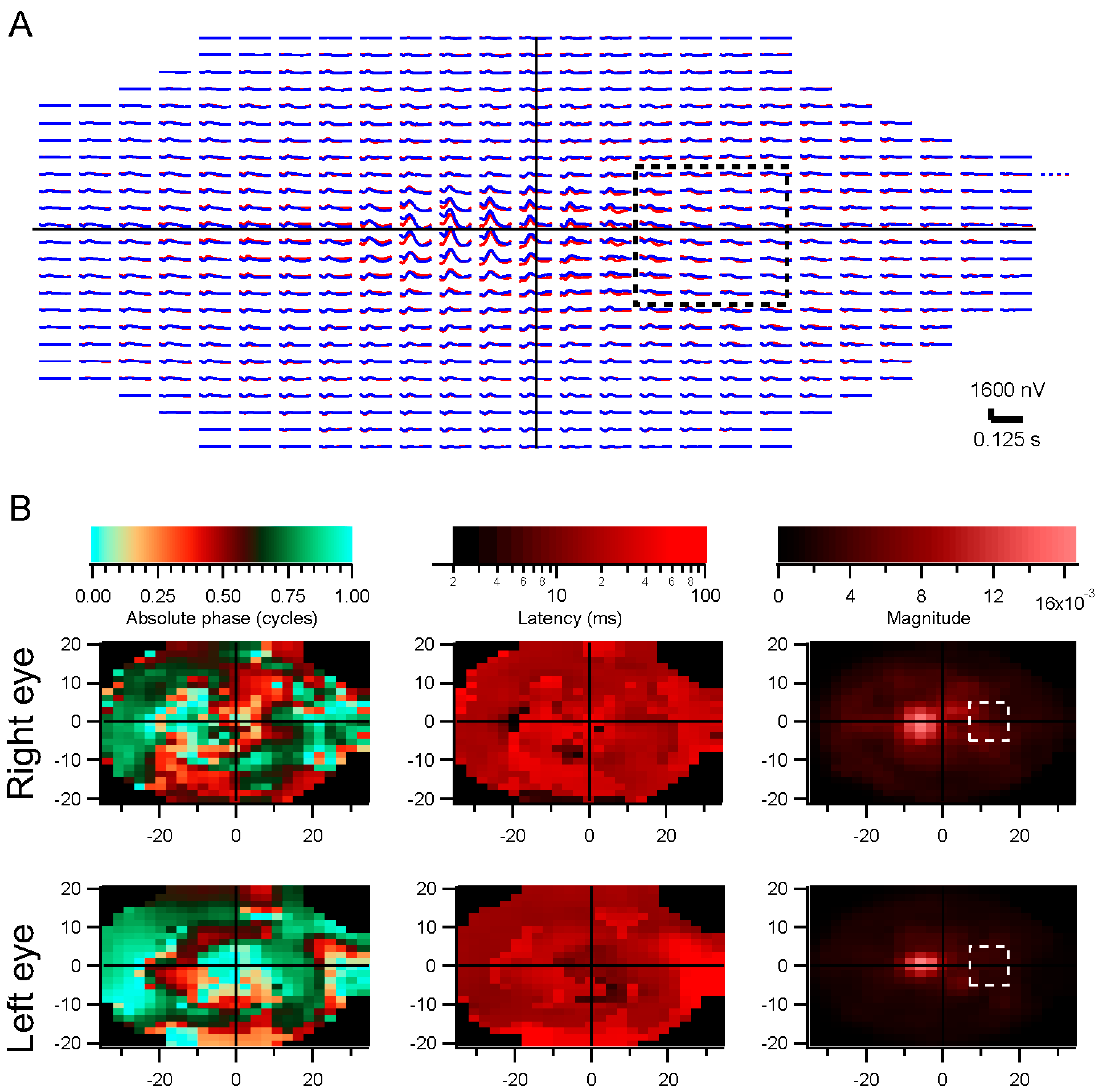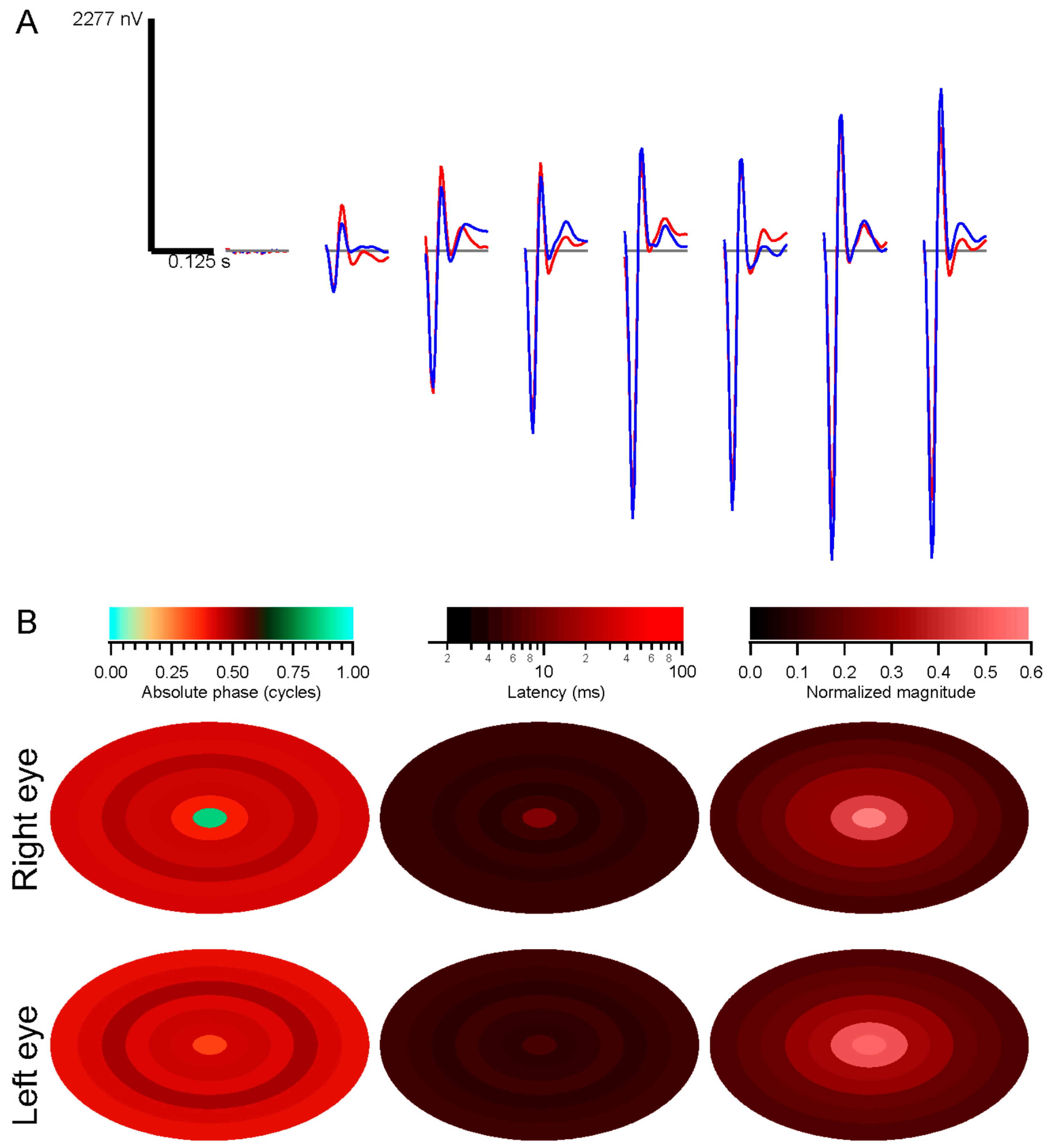 Conventional analysis: (A) subject was tested with seven concentric rings. Kernels from each ring are shown, moving from the central ring on the left to the most peripheral ring on the right. Kernels at the far left are controls. Red traces are from the right eye, blue from the left eye; (B) Summary of parameters measured from the kernels. Absolute phase, latency, and normalized magnitude are illustrated as pseudocolor plots against the stimulus spatial configuration. Magnitudes were normalized by stimulus area.