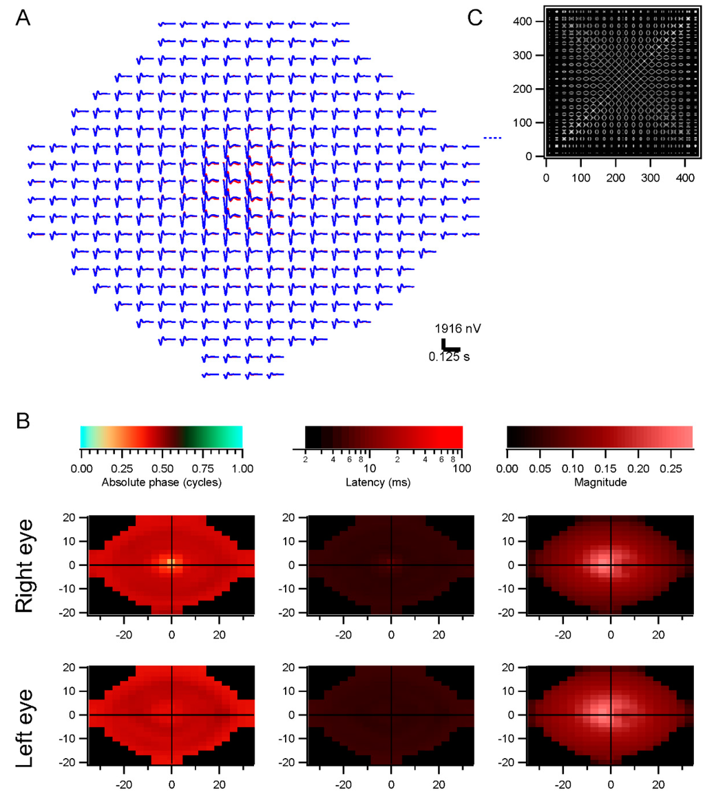 Among the flexible aspects of these methods, we can arbitrarily choose both the stimulus configuration and the analysis grid. For example, these can be customized to match features in a visual field, OCT, or fundus photo. The stimulus can be optimized to reveal pathologies at particular locations. The flexible methodology provides additional choices that can be seen as complicating clinical decision-making, but in many cases simplifies testing and makes it more efficient. For example, a common protocol is used for monitoring patients who have a long history of hydroxychloroquine use. Testing is conventionally done with a set of hexagonal stimulus elements that are then averaged across rings, to detect the typical pattern of bullseye maculopathy. By instead making the stimulus a small set of rings, more power is assigned to the stimulus, and the analysis is clearly simplified.