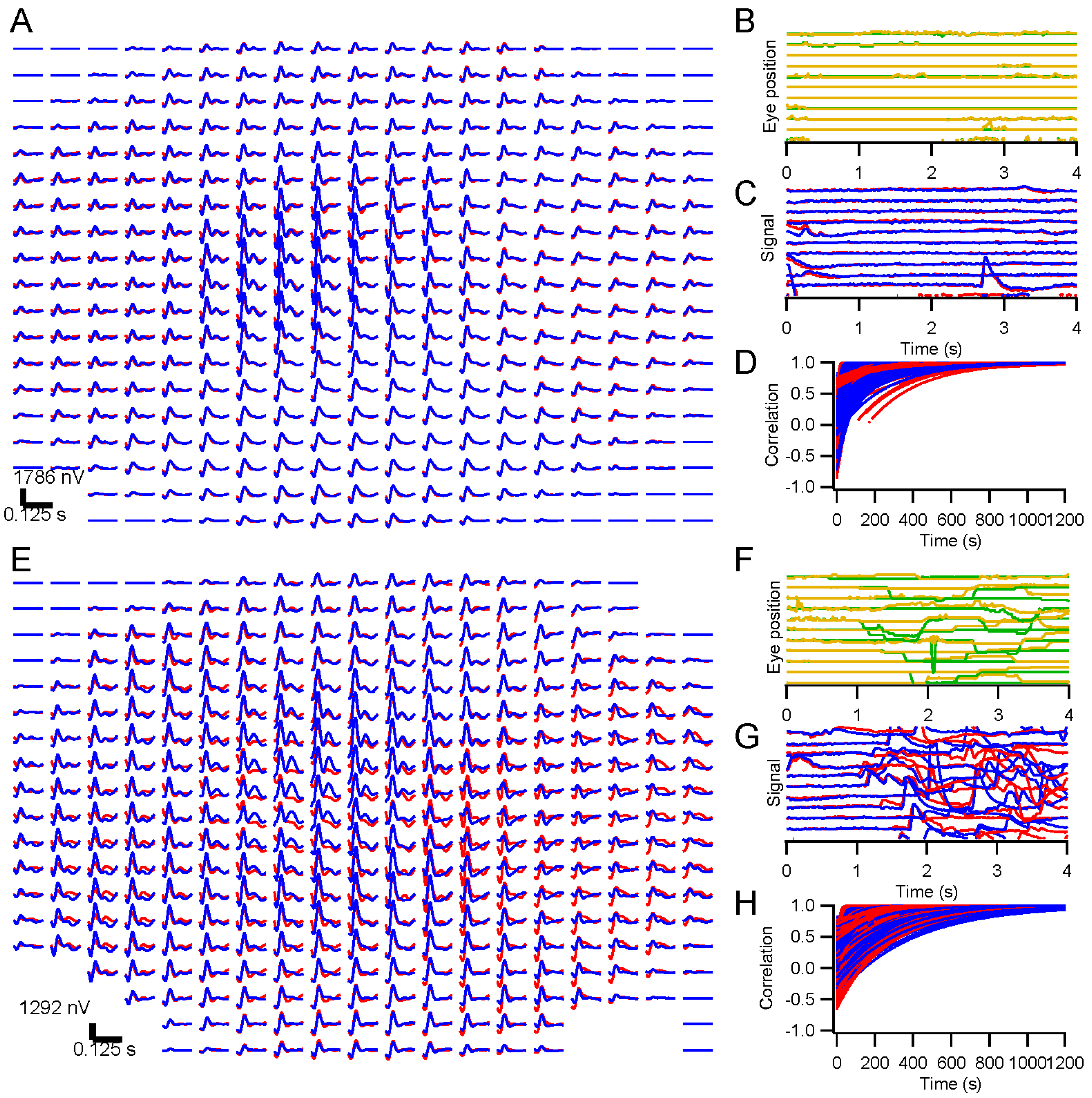Subjects were tested with interleaved trials on which they were asked to fixate or could look around the screen. The difference between these conditions is not absolute, but the number of eye movements was far greater in the non-fixation than in the fixation condition. Kernels were derived for these two conditions and compared. Figure 7A,E illustrate the trace arrays for such an experiment. The kernels from the fixation trials are illustrated in A, and from the non-fixation trials in E. Insufficient data were available at a few of the 361 positions because stimulus contrast was too low on most trials. Panels B and F show the eye position records from representative subsets of 10 trials. On the fixation trials, eye position was fairly constant, but on non-fixation trials the subject was permitted to read a line of text on the screen, making a series of fixations. Eye movements lead to artifacts in the electrode signals, as can be seen in panels C and G. The recordings in G are clearly filled with artifacts. Despite these disturbances, the kernels in E are similar to those in A. For example, a late positive response occurs through the left eye at some central positions in this subject under both conditions.