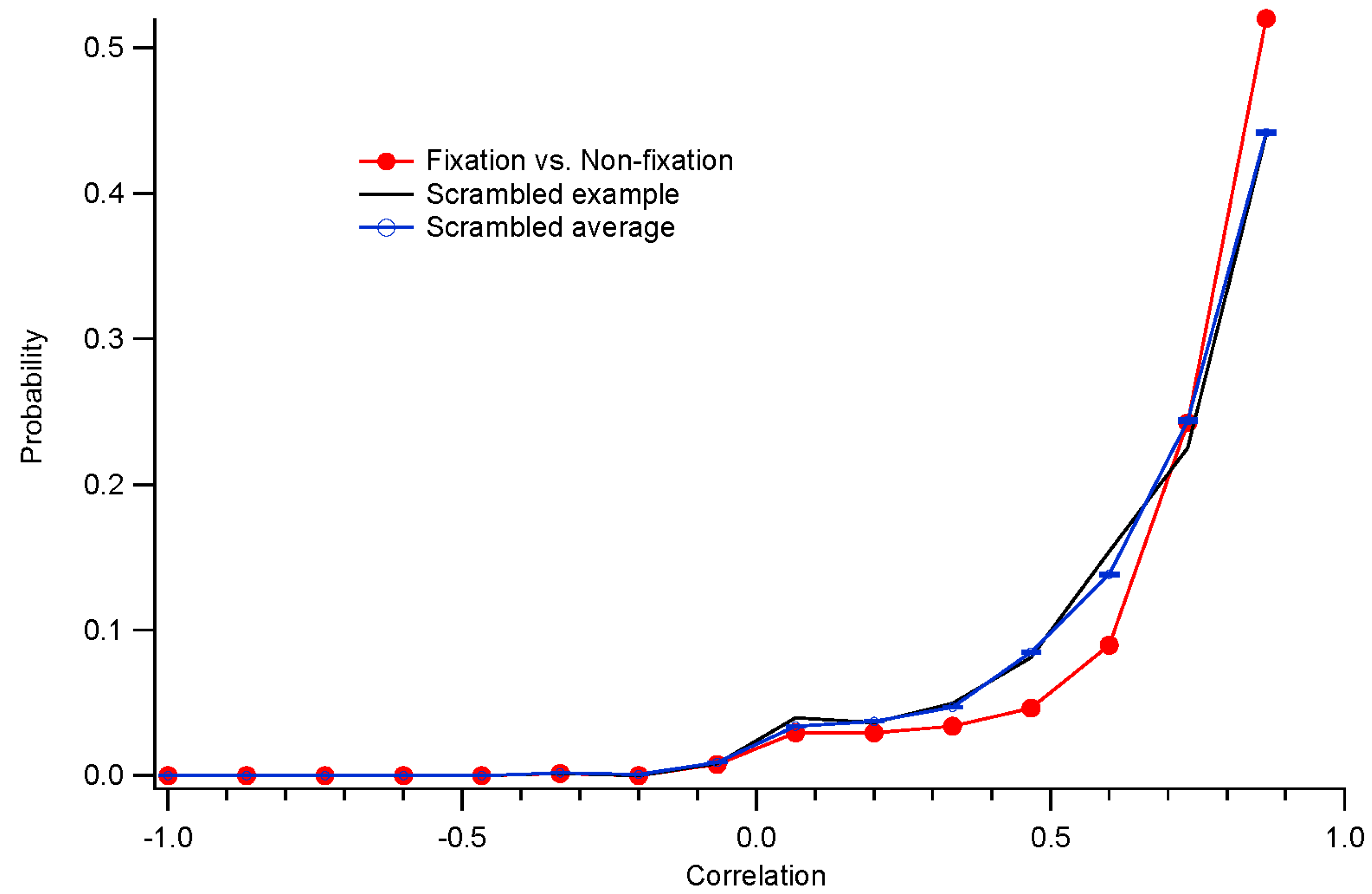 Histograms of correlations of kernels across fixation and non-fixation conditions. The red curve with solid circles shows the distribution of correlations between corresponding locations. The black trace with no symbols is an example of the correlations between scrambled positions. The blue curve with error bars shows the average distribution between scrambled positions as a control comparison.