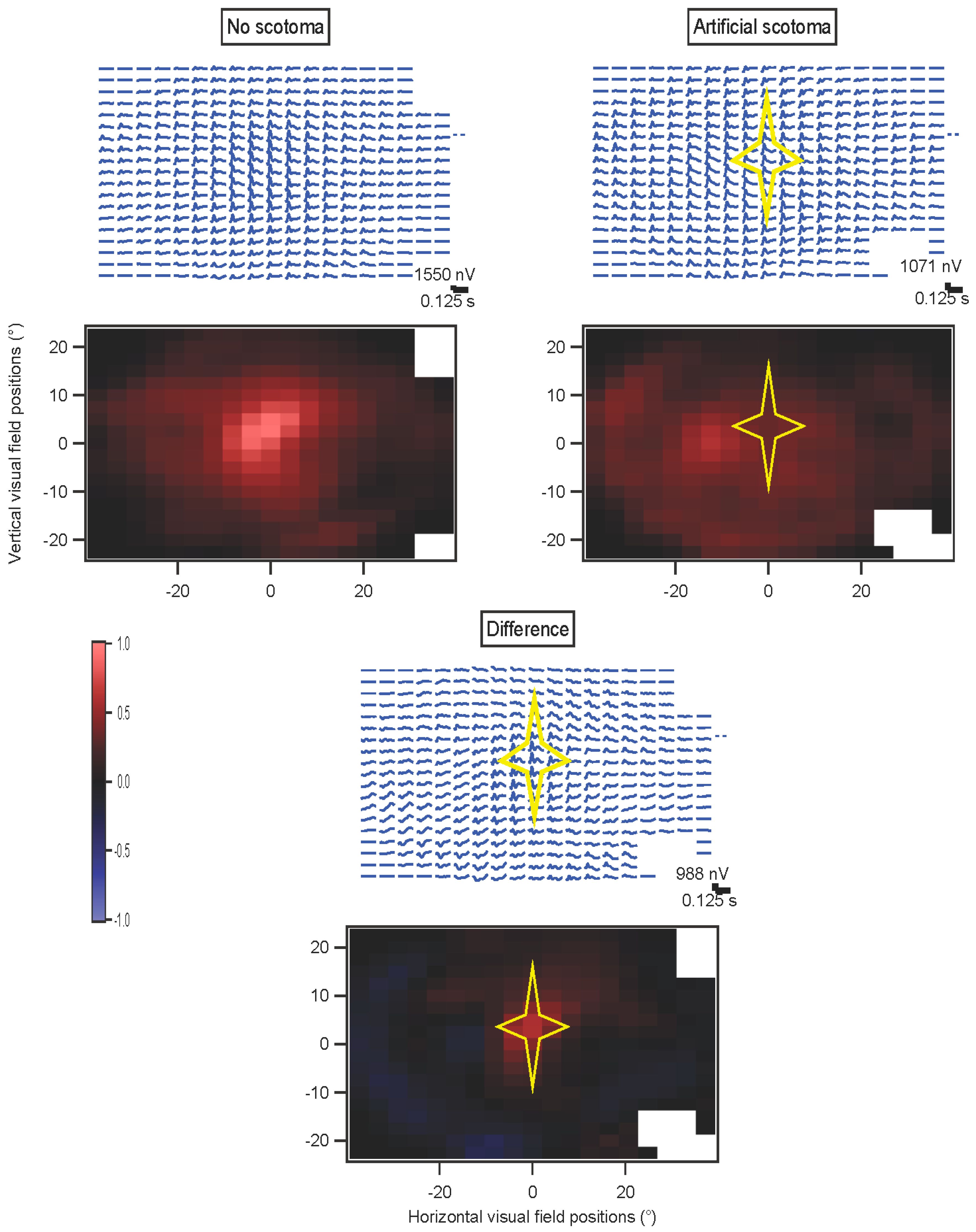 Artificial retinal scotoma. An example from the left eye of a subject is shown as visual field maps. The kernel arrays and the kernel values at 27 ms are shown for trials without and with a scotoma. At the bottom, the differences (no scotoma minus scotoma) are illustrated. The position of the star-shaped scotoma is indicated.