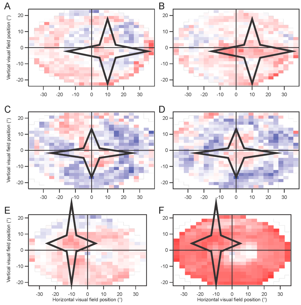In some experiments, a star-shaped portion of the screen was drawn in gray over the multifocal stimulus. This artificial scotoma was shifted with the eyes, to maintain its retinal position (Movie S2, Supplementary Materials). These experiments were performed using four randomly interleaved conditions: fixation trials with no scotoma; fixation trials with scotoma; non-fixation trials without scotoma; and non-fixation trials with scotoma. Results for each of the four conditions were extracted separately. The kernels for the scotoma conditions were then subtracted from the kernels for the non-scotoma conditions. A comparison was computed for the non-fixation conditions, where an index (difference divided by sum) comparing the non-scotoma and scotoma amplitudes was plotted to provide a statistical measure of the effects of the scotoma.