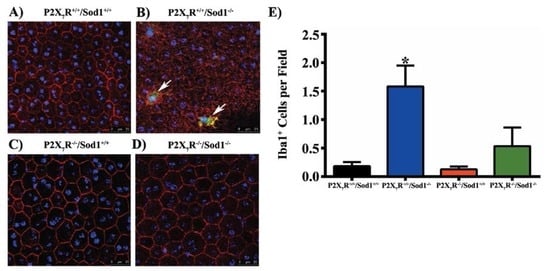 - Hu, S.J.; Calippe, B.; Lavalette, S.; Roubeix, C.; Montassar, F.; Housset, M.; Levy, O.; Delarasse, C.; Paques, M.; Sahel, J.A.; et al. Upregulation of P2RX7 in Cx3cr1-deficient mononuclear phagocytes leads to increased interleukin-1β secretion and photoreceptor neurodegeneration. J. Neurosci. 2015, 35, 6987–6996. [Google Scholar] [CrossRef] [PubMed]
