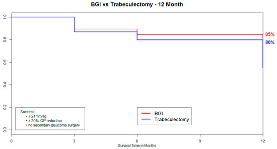 A total of 57 eyes that underwent Baerveldt 101-350 glaucoma implant and 38 eyes that underwent trabeculectomy cases with ExPress™ shunt were included in this study (Table 1). In both groups, the primary diagnosis was primary open angle glaucoma. Kaplan–Meier analysis resulted in a survival rate at 12 months of 85% in the eyes that underwent Baerveldt glaucoma implant and 80% in the eyes that underwent trabeculectomy (Figure 1). No statistically significant difference was found in survival distributions between surgery groups using a log–rank test (Figure 1). A total of 12 trabeculectomy and 9 Baerveldt glaucoma implant cases failed by our definition of success. Of these failures, all 12 trabeculectomy with the ExPress shunt required further glaucoma surgery, and 5 of the 9 Baerveldt glaucoma implant cases required further glaucoma surgery. There was no case of endophthalmitis. These cases were included in the analysis of IOP, number of glaucoma medications, and visual acuity (VA). At one year follow-up, the mean IOP was reduced from 20.6 ± 5.6 mmHg to 12.4 ± 3.2 mmHg in the Baerveldt glaucoma implant group and from 20.7 ± 5.5 mmHg to 11.3 ± 4.8 mmHg in the trabeculectomy with ExPress shunt group (Table 2). On average, Baerveldt glaucoma implant showed an IOP reduction of 7.7 ± 6.1 mmHg, while trabeculectomy showed 7.9 ± 5.2 mmHg IOP reduction at one year post-operation (Table 2, Figure 2). No statistically significant difference was found in IOP reduction between groups at any visit (Table 2).
