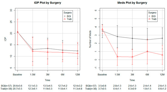 The present study reports outcomes in eyes that underwent each of these surgical modalities with open angle glaucoma, and which are naïve to previous incisional glaucoma surgery. Further investigations are needed to determine if a glaucoma drainage device can offer equally efficacious IOP lowering results as trabeculectomy as a primary surgical treatment in eyes with open angle glaucoma.