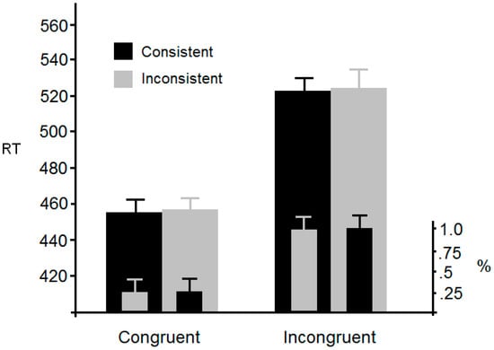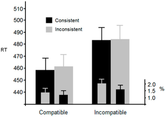 Figure 4 presents mean RTs for each condition. Outliers (2 SDs; 4.1%) were again omitted from further analysis. An ANOVA with compatible and incompatible as within-participant factors revealed a significant main effect of compatilbility, F(1, 25) = 14.8, p < 0.001, η2p = 0.37, but no significant main effect of consistency, F(1, 25) < 1. The interaction was not significant, F(1, 25) < 1.