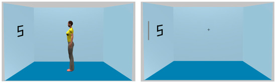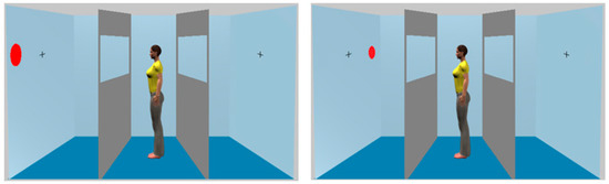 All aspects of these were as described previously with the following exceptions. A single red or green disc would appear on either the left hand or right hand wall of the room at the positions shown in Figure 3. A cross was located on both walls showing where the avatar gazed, and the avatar always faced the discs. The dimensions of the room were identical to those used by Samson et al. [1].