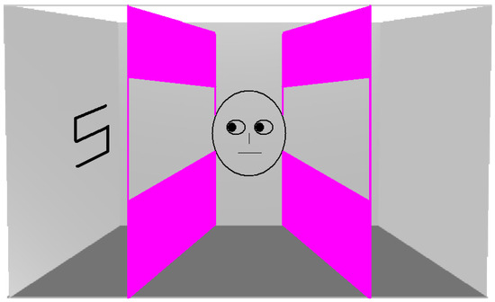 The notion of spontaneous perspective taking has not only come from the dot-perspective task. Results from the classic gaze cueing paradigm have also been argued to be due to, or at least modulated by, visual perspective taking. For instance, Nuku and Bekkering [3] pointed out that previous studies had not examined whether gaze cueing occurs as “a consequence of observing the others’ gaze direction or a consequence of inferring the others’ attended location” (p. 340). By manipulating whether the gazing agent’s eyes were open or closed, the authors went on to show that the gaze cueing effect only occurs “where the agent is believed to be attending to the object” (p. 340). Thus, ‘believing’ what the agent can or cannot see is clearly invoking ToM processes. However, using the barrier technique described in the Introduction above, Cole et al. [8] showed that the gaze following effect still occurs when the gaze cue cannot see the targets. This was observed when the gazing agent was both a real, physically present, person who was sat opposite the participant and when it was a photograph of a person presented on a monitor. Given the contradictory findings of previous work, the present Experiment 3 again examined the visual perspective account, this time with specific reference to the gaze cueing effect. We employed a schematic representation of a face (Figure 5), typically employed in this paradigm, together with the barrier manipulation. In half of the trials, the gazing agent could see the two lateral walls and, hence, targets. However, on the other half, the window-like structures were blocked, thus, preventing visibibility of the walls. As previously, if the computation of the gazing agent’s visual perspective underlies the gaze cueing effect, no such effect should occur when the agent cannot see the targets.