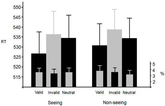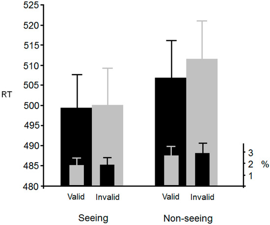 Of the responses, 4.2% were outliers (2 SDs) and were omitted from further analysis. Figure 6 shows mean RTs for each of the six conditions. An ANOVA with validity (valid, invalid, or neutral) and visibility (seeing or non-seeing) as within-participants factors revealed a significant main effect of validity, F(2, 82) = 3.5, p < 0.05, η2p = 0.078, but no significant main effect of visibility, F(1, 41) < 1. The interaction was not significant, F(2, 82) < 1.