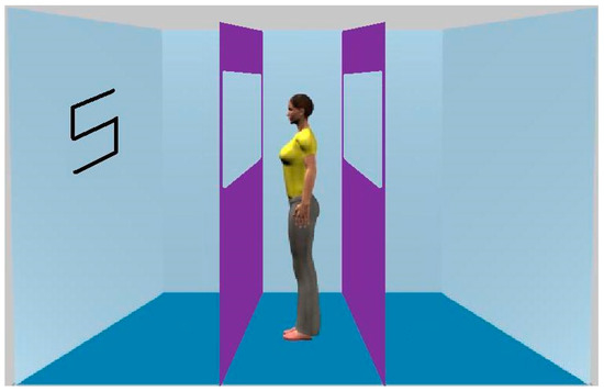 A stimulus used in Experiment 1. Note that in order to have parity with our other experiments, the barriers were also present, but always allowed the avatar to see the lateral wall.
