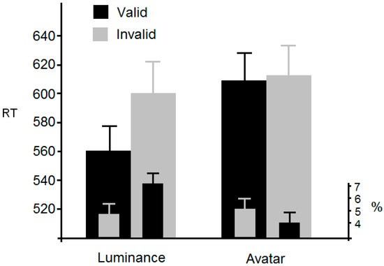Outliers (2 SDs) were removed accounting for 4.3% of the data. Figure 9 shows the mean RTs. An ANOVA with validity and cue-type as within-participant factors revealed a significant main effect of validity, F(1, 27) = 15.9, p < 0.001, η2p = 0.37, and cue type, F(1, 27) = 22.6, p < 0.001, η2p = 0.46. The interaction was also significant, F(1, 27) = 12.1, p < 0.002, η2p = 0.31. Simple analyses revealed that the interaction was due to a cueing effect occurring in the luminance-cue condition, t(27) = 4.4, p < 0.001, but not in the avatar-cue condition, t(27) = 0.89, p > 0.38. With respect to errors, an ANOVA using the same factors and levels described above revealed a non-significant main effect of validity, F(1, 27) = 2.2, p < 0.16, η2p = 0.08, and cue type, F(1, 27) = 2.8, p < 0.12, η2p = 0.1. The interaction was, however, significant, F(1, 27) = 6.2, p < 0.02, η2p = 0.19. Simple analyses revealed a significant reduction of errors in the luminance-cue condition, t(27) = 2.4, p < 0.05, but not in the avatar-cue condition, t(27) = 0.69, p > 0.49.