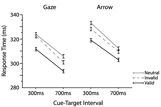 The study was a repeated measures design with cue type (gaze, arrow), cue validity (valid, invalid, neutral), cue-target interval (300 and 700 ms), and target type (X, O) manipulated as factors. Cue type was blocked, with the order of presentation counterbalanced between participants. Cue validity, cue-target interval, and target type were intermixed and presented equally often within each cue condition. Cues could indicate either a left or right peripheral location. The target could appear at either the left or right peripheral location. Cue validity reflected the match between the cue direction (left; right; neutral) and target location (left; right). Trials on which the target occurred at the location indicated by the gaze/arrow cue were labeled as valid; those on which the target occurred at the location not indicated by the gaze/arrow cue were labeled as invalid; finally, trials on which targets occurred in either the left or right locations following the neutral cue were labeled as neutral. Cue-target interval reflected the time between the presentation of the cue and the presentation of the target. Following from past studies (e.g., [4,17]), we included one short (300 ms) and one longer cue-target interval (700 ms) to capture attentional effects of gaze and arrow cues, both of which have been found to be robust at each of these cue-target delays.