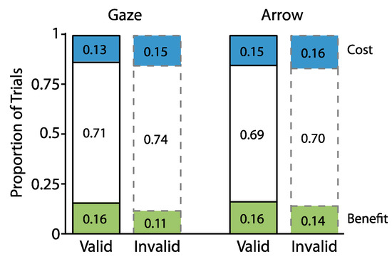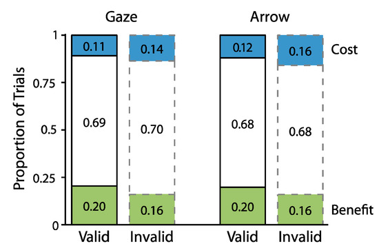 Finally, like many past studies [18,20,23], our examination also did not reveal reliable differences across gaze and arrow cues. Unlike orienting to gaze direction, which is thought to reflect evolutionarily driven social biases [1,2,3,5], attentional orienting in response to arrows is purported to reflect an automated process, which arises as a function of overlearning the meaning of behaviorally relevant symbols [24,25,26]. Despite this fundamental difference, cuing tasks continue to show similar overall performance across gaze and arrow cues ([18,20,23]; but see [19]). The present investigation is the first to our knowledge to examine whether the two types of cues may also differ in individual instances of orienting. Our results for both gaze cues and arrow cues were once again indistinguishable. They indicated the presence of benefits and costs on less than half of valid and invalid trials, with the proportion of benefits on valid trials ranging between 16% and 20%, and the proportion of costs on invalid trials ranging between 14% and 16% for both gaze and arrow cues across the two experiments. Additionally, when we compared the proportions of benefits and costs across valid and invalid trials, the absence of significant interactions involving cue type for each experiment indicated that the result showing a greater proportion of benefits relative to costs on valid trials and a greater proportion of costs relative to benefits on invalid trials was not preferentially driven by the social or automated cue type.