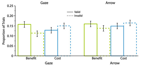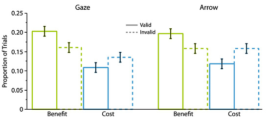 Second, a repeated measures ANOVA, which examined the proportions of benefits and costs as a function of cue type (gaze, arrow), cue validity (valid, invalid), and cue-target interval (300, 700 ms) returned a main effect of cue type (F(1,24) = 9.55, p = 0.005, ηp2 = 0.28) and a reliable interaction between attentional orienting and cue validity (F(1,24) = 16.99, p = 0.0004, ηp2 = 0.42). As illustrated in Figure 7, this interaction indicated that a greater proportion of valid (M = 0.16, SD = 0.05) compared to invalid trials (M = 0.13, SD = 0.04) were classified as benefits (t(24) = 4.41, p < 0.0001, two-tailed, paired, dz = 0.88), while a greater proportion of invalid (M = 0.16, SD = 0.03) relative to valid trials (M= 0.14, SD = 0.04) were classified as costs (t(24) = 2.55, p = 0.02, two-tailed, paired, dz = 0.51). No other effects were reliable (all Fs < 3.05, 0.09 < p < 0.90).