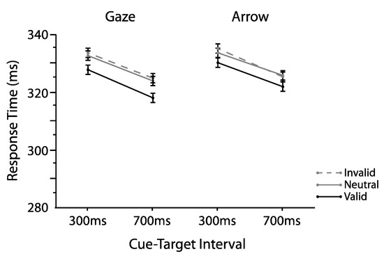 Figure 5 shows mean correct interparticipant RTs as a function of cue type, cue validity, and cue-target interval. The omnibus repeated measures ANOVA indicated a main effect of cue validity (F(2,48) = 10.00, p = 0.0002, ηp2 = 0.29), with responses on validly cued trials (M = 324.40, SD = 44.30) overall reliably faster than responses on both invalidly cued (M = 329.38, SD = 46.24, t(24) = 3.33, p = 0.003, two-tailed, paired dz = 0.67) and neutral trials (M = 328.82, SD = 44.87, t(24) = 3.35, p = 0.003, two-tailed, paired, dz = 0.67). The main effect of cue-target interval was reliable once again (F(1,24) = 14.10, p = 0.001, ηp2 = 0.37) with no other effects or interactions (all Fs < 0.52, ps > 0.60). Thus, as in Experiment 1, both gaze and arrow cues produced reliable and equivalent orienting effects overall (all interactions involving cue type, Fs < 0.52, ps > 0.60).