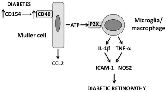 The CD40-ATP-P2X7 pathway links cellular responses in Müller cells with the induction of inflammatory responses in bystander microglia/macrophages in DR. Blood levels of CD154 and expression of CD40 on Müller cells are increased in diabetes. CD40 ligation in Müller cells causes CCL2 upregulation and secretion of extracellular ATP. In turn, ATP binds P2X7 expressed in microglia/macrophages leading to upregulation of TNF-α and IL-1β as well as ICAM-1 and NOS2, pro-inflammatory molecules that can be induced by these inflammatory cytokines.