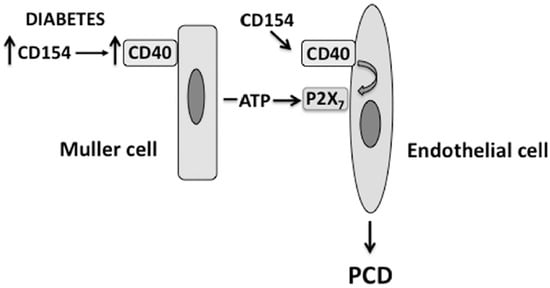 Death of REC results in the development of degenerate capillaries, an event believed to cause retinal ischemia. Various mechanisms appear to contribute to the development of capillary degeneration. These include increased oxidative and nitrosative stress [,,,,] as well as expression of inflammatory molecules (TNF-α, IL-1, ICAM-1) [,,,]. CD40 is upregulated in REC of diabetic mice and the presence of CD40 is required for development of capillary degeneration. However, CD40 ligation on endothelial cells promotes their survival rather than death. P2X7 can induce cell death by apoptosis or necrosis []. Indeed, the CD40-ATP-P2X7 pathway explains how CD40 can lead to PCD of REC. Müller cells closely associate with REC and, as explained above, secrete ATP in response to CD40 ligation. While REC are relatively resistant to PCD when incubated with extracellular ATP, CD40 ligation in these cells causes P2X7 upregulation making them susceptible to ATP-dependent PCD []. This mechanism is likely to occur in vivo since P2X7 is upregulated in REC from diabetic B6 but not CD40−/− mice, and diabetic CD40−/− and P2X7−/− mice exhibit reduced PCD of REC []. Altogether, the CD40-ATP-P2X7 pathway appears to be an important driver of PCD of REC in diabetes (Figure 2). Given that primary human pericytes also express CD40 (J-A Portillo and C.S. Subauste, unpublished observations), it is possible that the CD40-ATP-P2X7 pathway may also mediate PCD of retinal pericytes in diabetes.