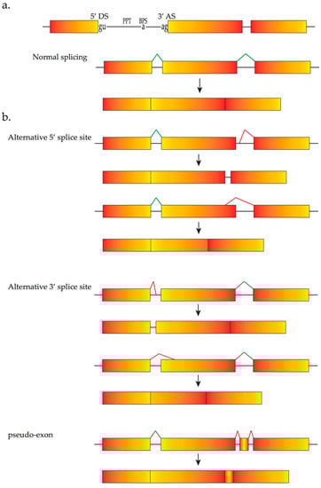 - Pagani, F.; Baralle, F.E. Genomic variants in exons and introns: Identifying the splicing spoilers. Nat. Rev. Genet. 2004, 5, 389–396. [Google Scholar] [CrossRef] [PubMed]