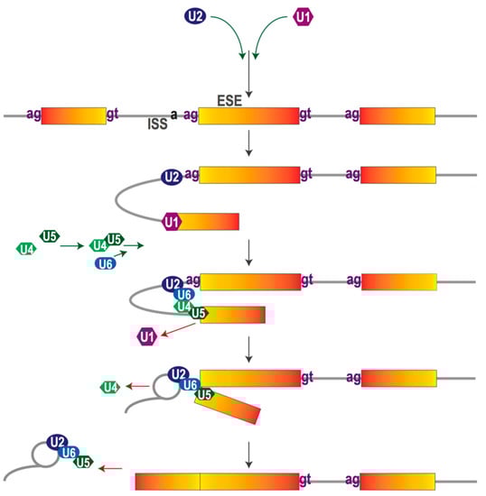 Pre-mRNA splicing is catalyzed by the spliceosome, a macromolecular complex consisting of five uridine-rich small nuclear ribonucleic proteins (snRNP) U1, U2, U4, U5 and U6, each containing a small nuclear RNA (snRNA) combined with various proteins, as well as other less stably associated splicing factors [22]. These trans-acting factors are able to recognize and interact with specific pre-mRNA cis-acting sequences based on the base-pair principle. Examples of trans-acting factors are the heterogeneous nuclear ribonucleoproteins (hnRNPs) which mainly exert suppressive effects, and the serine- and arginine-rich (SR) proteins, which bind to intronic splicing enhancers or exonic splicing enhancers to promote splicing [23,24,25]. For more details of splicing regulatory factors/influences, readers are referred to other thorough reviews [26,27,28]). All these factors act either antagonistically or synergistically to determine the RNA sequence. When splicing begins, the U1 snRNP recognizes the splice donor site, followed by binding of the U2 snRNP to the branch point sequence. Subsequently, these snRNPs are combined with the U4/U5/U6 tri-snRNP complex, to create the mature spliceosome that catalyzes two trans-esterification reactions associated with a series of conformational changes. This process allows the joining of exons and the removal of the intervening introns [29] (Figure 2).