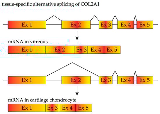 COL2A1 provides another example illustrating the significance of tissue-specific splicing variants in different diseases. Wagner’s disease has a purely ocular phenotype, mainly associated with vitreous degeneration and/or retinal pigmentation beginning in adolescence, whereas Stickler syndrome type I, an autosomal dominant disease, shows extra-ocular manifestations as well as vitreous anomaly and progressive ocular complications such as retinal detachment. Either of these disorders can be caused by mutations in the COL2A1 gene. Two forms of procollagen II are produced from COL2A1 as the result of alternative splicing of exon 2 (Figure 3). A longer form containing exon 2 is predominantly expressed in the vitreous body, whilst a shorter form lacking exon 2 is mainly found in adult cartilage [46,47]. Such features of alternative splicing explain the variability of phenotypes associated with COL2A1 mutations: mutations in a tissue-specific alternatively spliced exon of COL2A1 may result in Wagner’s disease or ocular only Stickler syndrome whilst Stickler syndrome due to mutations of COL2A1 without involving exon 2 affects both cartilage and vitreous. For instance, Cys86Stop [48], caused by a C to A nonsense mutation, or Cys57Stop, caused by a frame-shift mutation are located in COL2A1 exon 2 [44], and these mutations result in few or no extra-ocular manifestations [49].