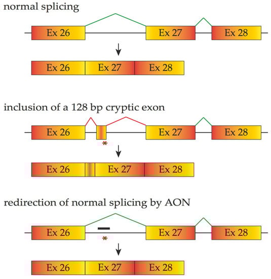 Small deletions and insertions account for approximately 23% of retinal diseases and can lead to premature termination codons and altered splicing outcomes through reading-frame disruption. The mRNAs carrying premature termination codons are eliminated through a nonsense-mediated decay mechanism. However, some premature termination codons may disrupt exonic splicing enhancers, resulting in the exclusion of the affected exon from the final mRNA [57]. Gross DNA deletions or rearrangements are less common, accounting for 12% of retinal dysfunctions. Mutations residing within non-coding introns could change the amino acid sequence of a protein by affecting splicing patterns. For instance, among the various mutations causing Leber congenital amaurosis (viz. LCA and Online Mendelian Inheritance in Man Entry 204000), a deep-intronic point mutation (c.2991 + 1655A > G) of CEP290 is one of the most frequent mutations that act by introducing a cryptic splice donor site, thus resulting in inclusion of a 128 bp pseudo-exon encoding a premature stop codon (Figure 4) [58].