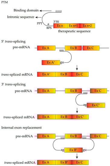 Spliceosome-mediated RNA trans-splicing (SMaRT) is another mRNA repair strategy. Trans-splicing is a natural splicing phenomenon occurring at much lower frequencies compared to cis-splicing processes [96]. Trans-splicing can generate a new recombination of mRNA that contains the 5′ part of one pre-mRNA and the 3′ part of another pre-mRNA. SMaRT utilizes a pre-trans-splicing molecule (PTM), which contains a therapeutic replacement sequence to be introduced to the target mRNA, an antisense binding domain that anneals with specific intronic sequences of target pre-mRNA and an artificial intron sequence that contains all essential elements for splicing. Depending on the orientation of PTM, three kinds of SMaRT are available; 5′- or 3′- trans-splicing and internal exon replacement, which replace the 5′-exons, 3′-exons and internal exons, respectively (Figure 5).