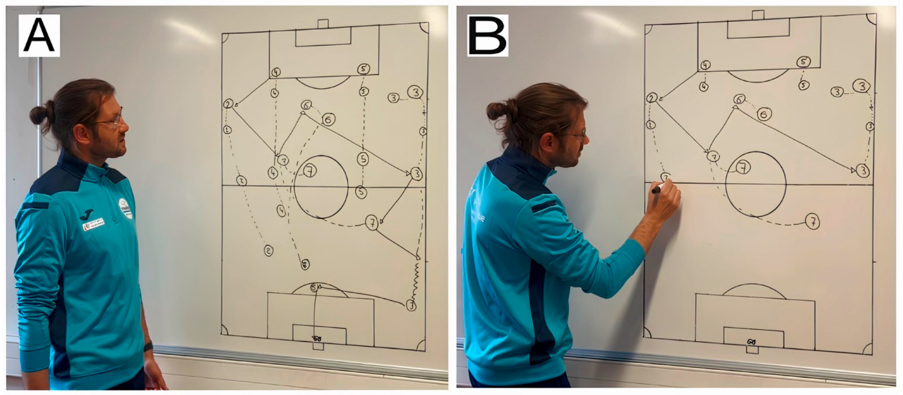 - Tlili, S.; Zoudji, B.; Ben Mahfoudh, H. The Role of Coaches’ Drawing in Memorizing Tactical Soccer Scene: A Visuospatial Abilities Moderation Analysis. J. Imag. Res. Sport Phys. Act. 2025, 20, 20240031. [Google Scholar] [CrossRef]