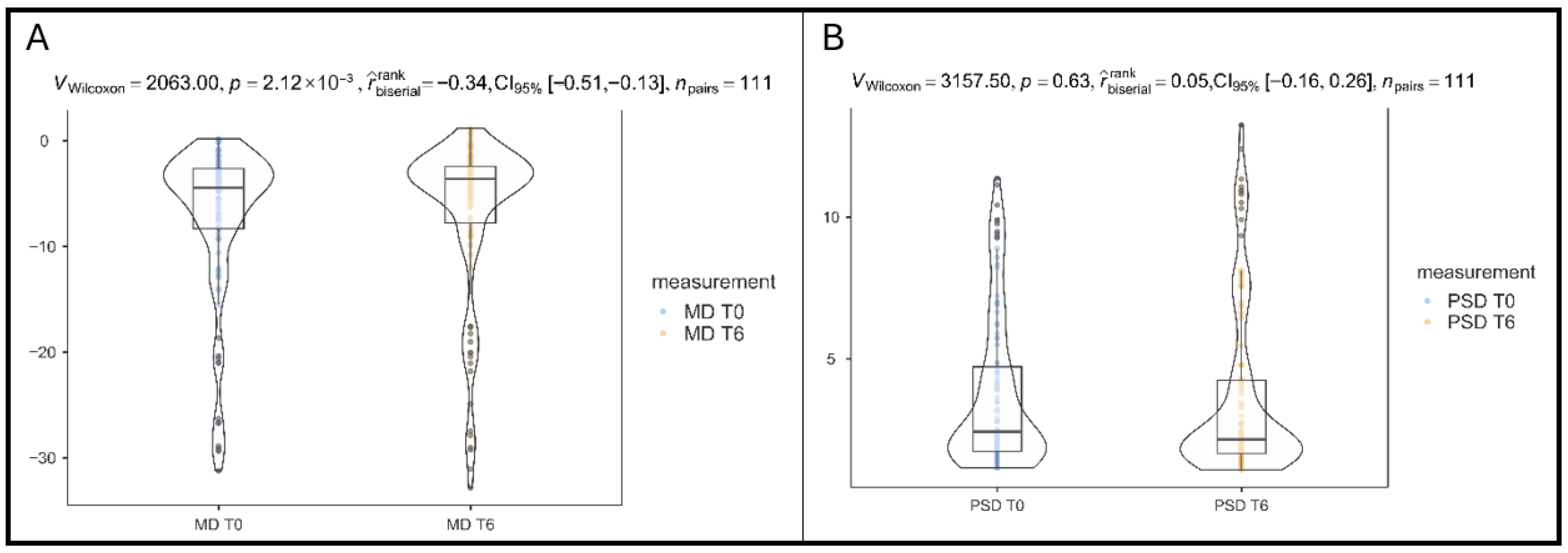 | MD (db, decibels) T6 Mean ± SD Median (Interquartile Range) Shapiro–Wilk p | −6.56 ± 7.59 −3.69 (4.57) <0.001 | −7.03 ± 8.08 −3.61 (6.09) <0.001 | 0.885 |