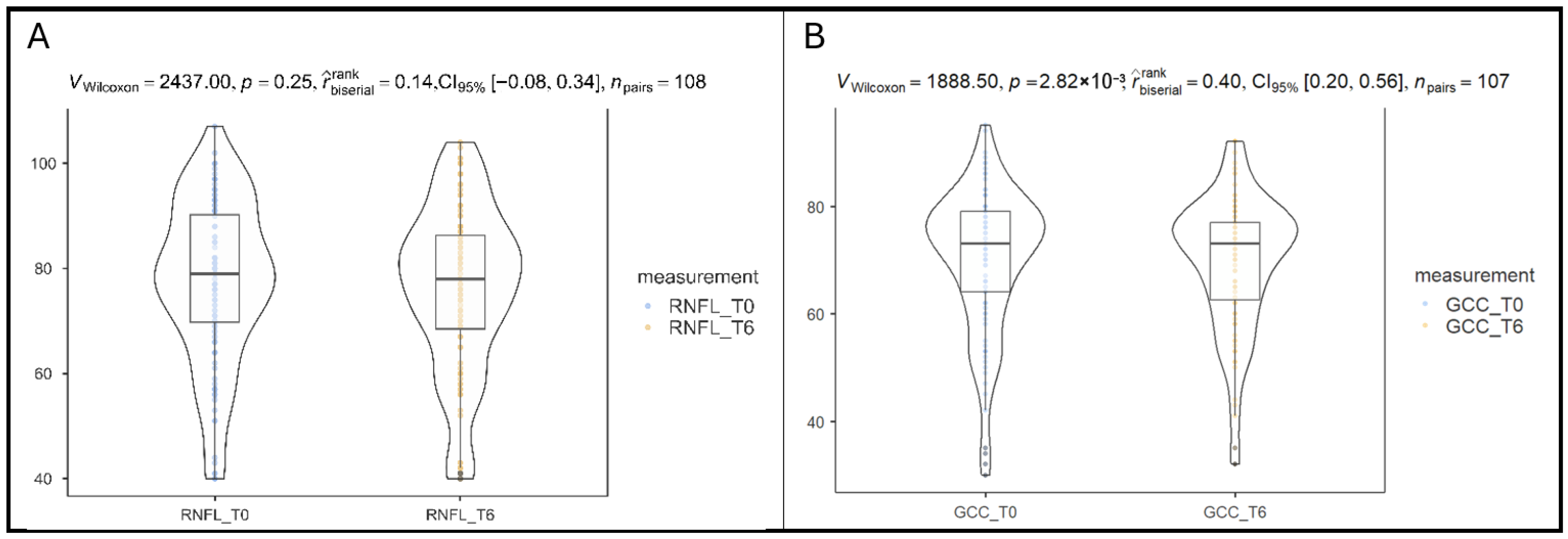| RNFL baseline Mean ± SD Median (Interquartile Range) Shapiro–Wilk p | 77.6 ±15.7 77 (22) 0.026 | 76.7 ± 15.5 79 (20.5) 0.233 | 0.707 |