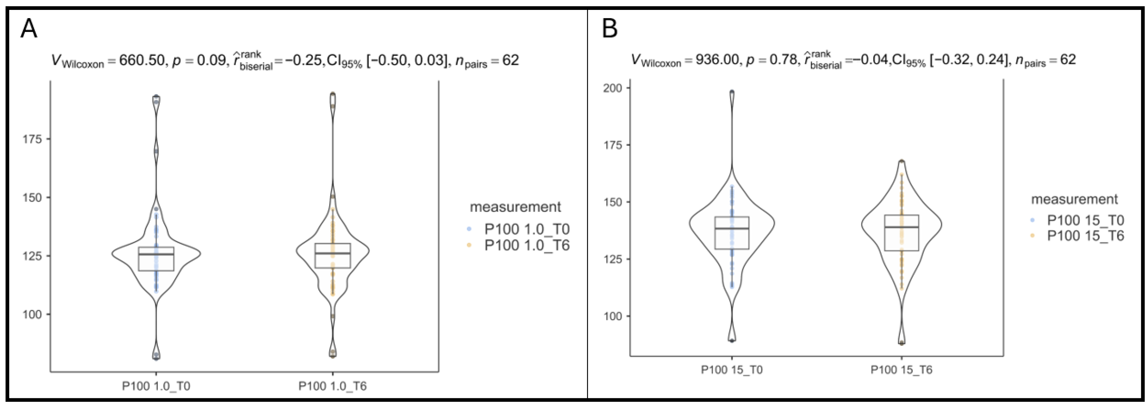 | P100 1.0 baseline Mean ± SD Median (Interquartile Range) Shapiro–Wilk p | 126 ± 15.6 126 (8.98) <0.001 | 127 ± 18.2 125 (10.1) <0.001 | 0.715 |