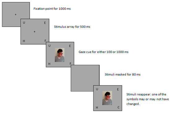 Participants were positioned 57 cm away from the display with their heads in a chinrest. Each participant completed three blocks of 80 trials, completing 240 trials in total. The study had 20% valid trials, 60% invalid trials, and 20% catch trials, in which no change occurred. As there were four potential stimulus locations, a 4:1 ratio of valid to invalid trials was necessary to ensure that the gaze cue was non-predictive of change location.