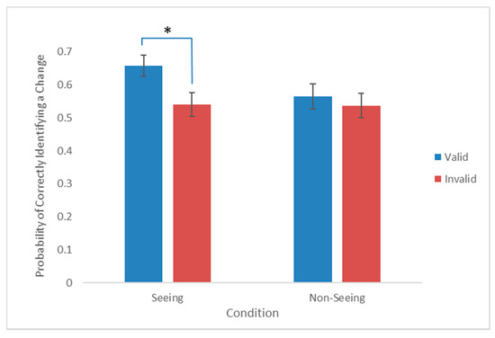 The probability of correctly identifying a change on the valid and invalid trials in the seeing and non-seeing conditions. Error bars show +/−1 within-subject standard error of the mean (S.E.M). * Indicates p < 0.05.