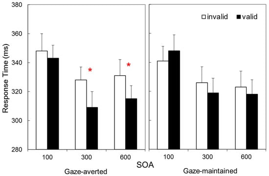 Figure 2 presents Mean RT as a function of validity, SOA, and Avatar-Stance. These data suggest a cue validity effect only for gaze-averted avatars at longer SOAs. These impressions were confirmed by a 2 × 3 × 2 repeated measures Analysis of Variance (ANOVA), with Validity (valid vs. invalid), SOA (100 vs. 300 vs. 600 ms), and Avatar-Stance (gaze-averted vs. gaze-maintained) as factors. This revealed main effects of Validity,