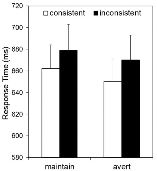 Figure 3 illustrates that RTs appeared to be elevated for inconsistent relative to consistent conditions, and by a similar extent for gaze-averted and gaze-maintained avatars. These data were analysed by a 2 × 2 repeated measures ANOVA, with Consistency (consistent vs. inconsistent) and Avatar-Stance (gaze-averted vs. gaze-maintained) as factors. This revealed a main effect of Consistency,