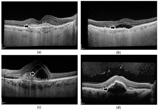 Spectral-Domain Optical Coherence Tomography images demonstrating (a) subretinal hyper-reflective material, (b) subretinal fluid, (c) intraretinal fluid, and (d) pigment epithelial detachment. Black arrows indicate the respective morphological features.