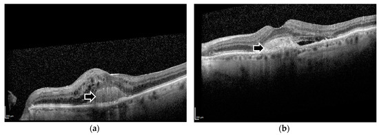 Spectral-Domain Optical Coherence Tomography images demonstrating foveal subretinal hyper-reflective material that is (a) distinct and (b) indistinct from the underlying retinal pigment epithelium. Black arrows indicate the respective morphological features.